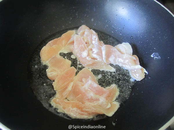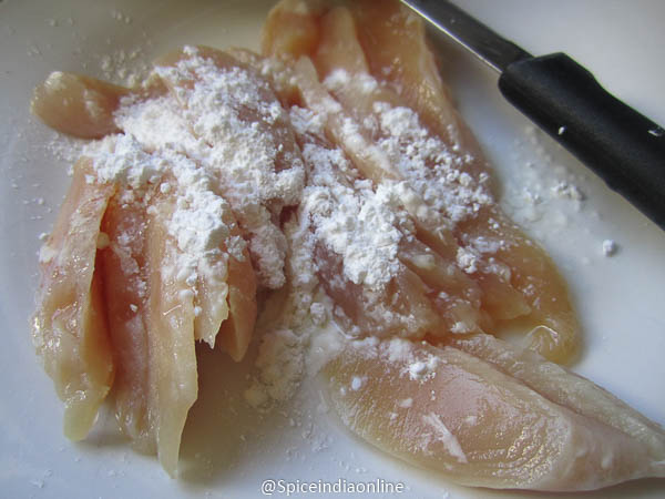 Cut boneless chicken into thin strips and dust them with corn flour. (no salt needed)