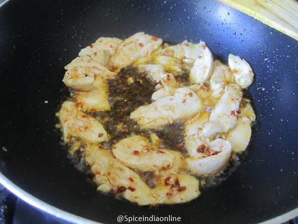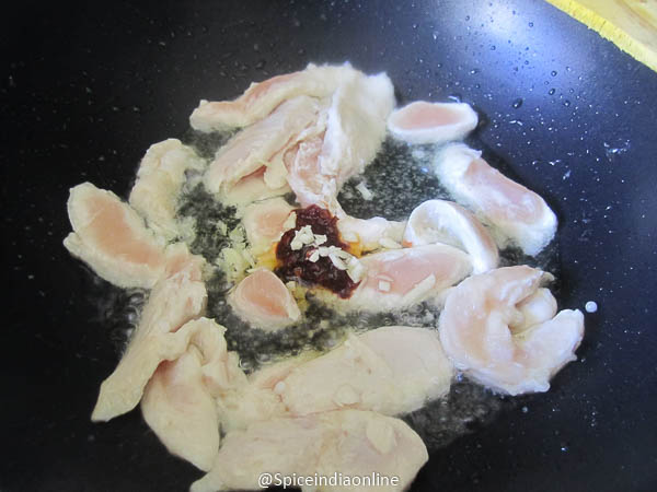 Heat peanut oil in a wok and fry the chicken pieces in oil.