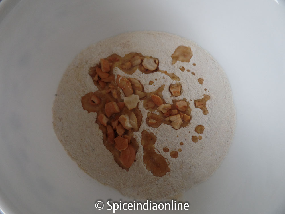 Combine moong flour, powdered sugar & cardamom in a bowl. Heat ghee in a tawa and roast cashews till they are golden and then add that to the flour mixture. Mix using a spoon to a crumbly texture. Roll them into small balls while its still warm. It may appear sticky while making the balls but once cooled for about 15 minutes they become firm.