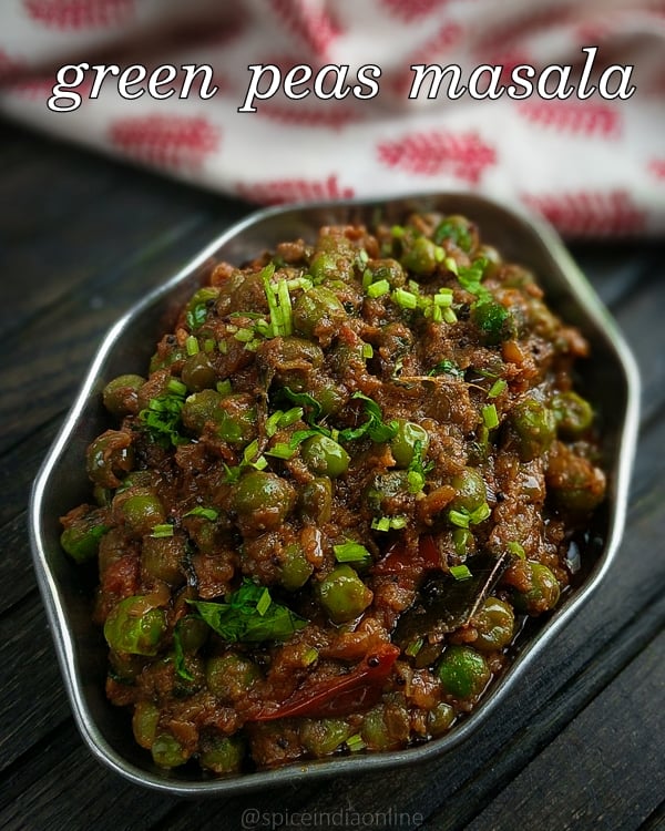 Green Peas stir fried with semi thick spicy tomato onion masala, perfect side for rice or chapati!