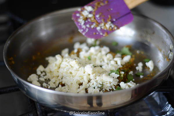 Add in homemade fresh paneer or use store bought grated paneer and coat the masala. Just light saute is enough… do not cook the paneer.