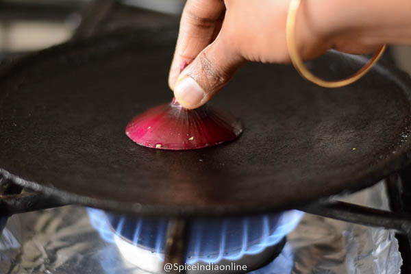 Lets make the dosai… Heat up an iron dosai kal (pan), rub it with an onion to get your dosai off the pan smooth….(remember the iron pan needs to be hot when you make the dosai or else your dosai wont cook up right nor turn crisp)