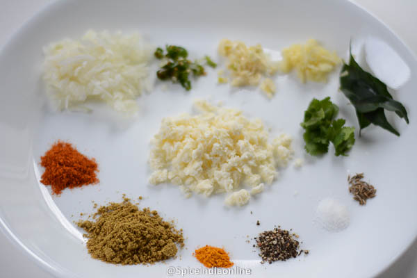 These are the ingredients all lined up… try to use fresh paneer if possible for more succulent stuffing, the rest of the ingredints all finely minced would be better. Fresh ground black pepper really makes a difference. (Tomatoes are not included here… but if you prefer more chunky then include 1/4 cup)