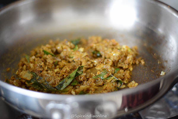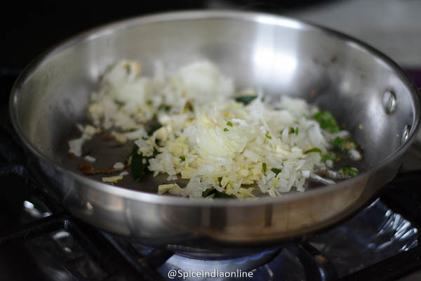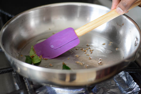 Heat oil in a pan and splutter cumin seeds along with curry leaves. Let them sizzle for few seconds.