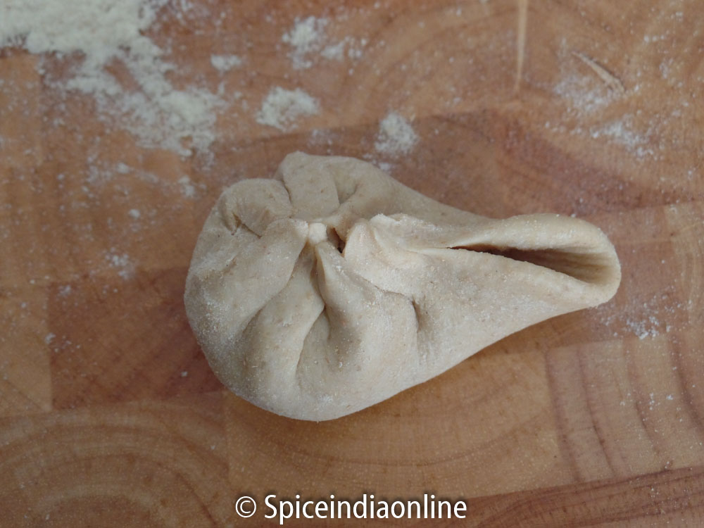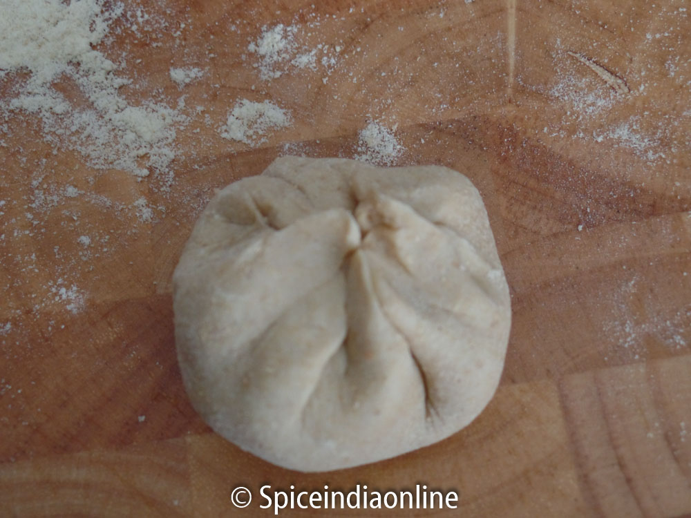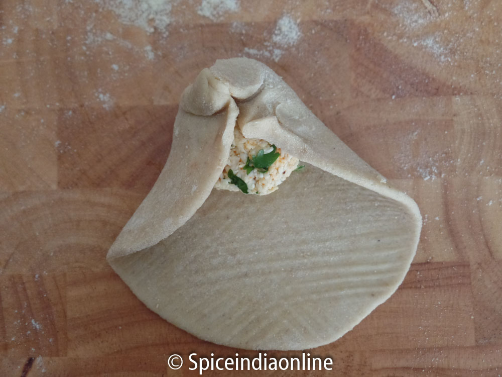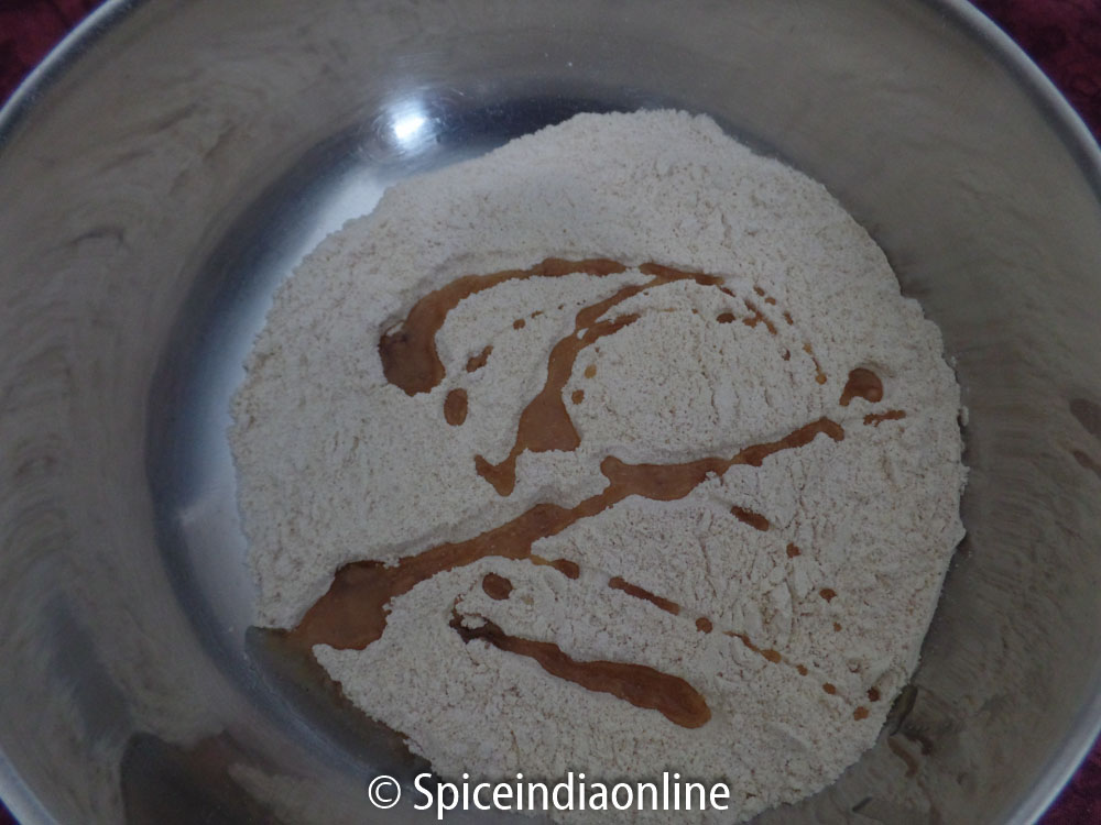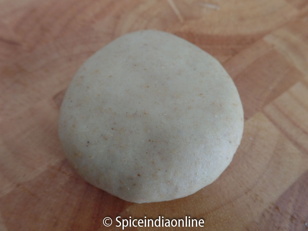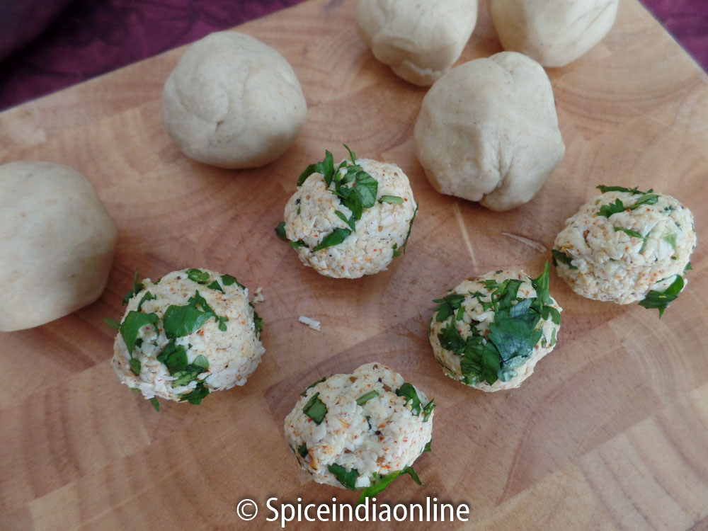To make the dough – Combine wheat flour, salt, ghee or oil and mix. Slowly add water little by little and make a soft pliable dough. The dough should be soft and firm and non sticky. Cover the dough the keep it aside to rest while you work on the stuffing. Let it rest for at least 30 minutes, covered with a cloth or plate.