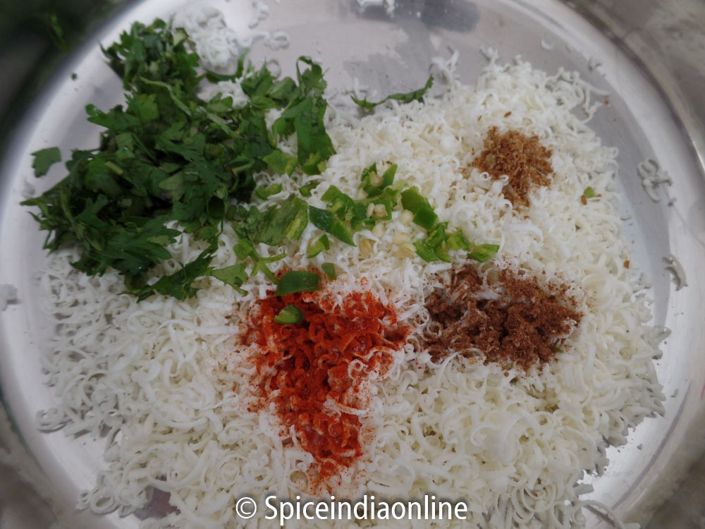 To make the stuffing – Grate paneer and combine that with red chili powder, cumin powder, garam masala powder, chopped green chili, coriander leaves and salt. Mix well to combine.
