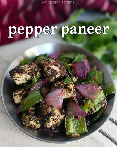 Paneer stir fried with veggies and black pepper! Quick dry curry that can be served as an appetizer best stuffing for lunch roll or sandwich.