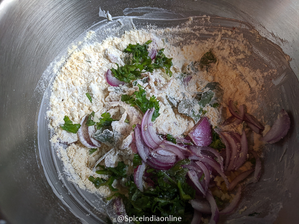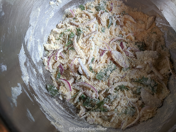- Assemble all the other ingredients – whatever onion you use, try to slice them thinly. Mince the green chillies, ginger, coriander leaves and curry leaves. Any fat like butter, vanaspati, vegetable shortening, ghee at room temperature works for this recipe. This is keep the outer texture crispy for long and inner texture soft.