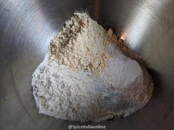 Add in the rice flour, gram flour and roasted gram flour along with salt.
