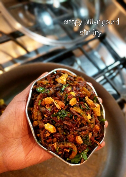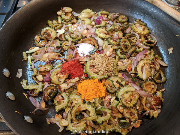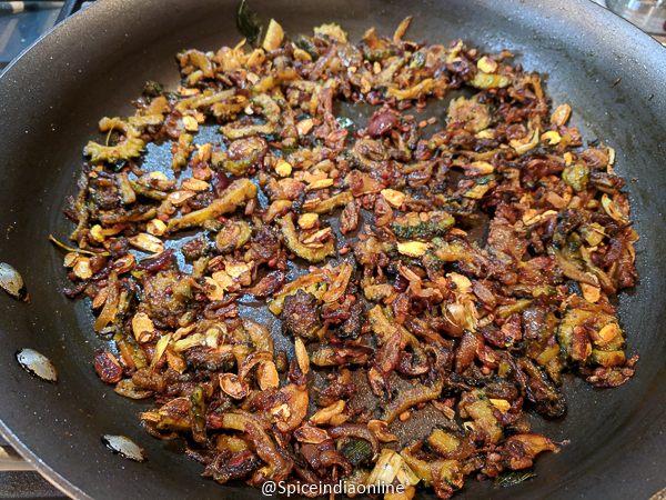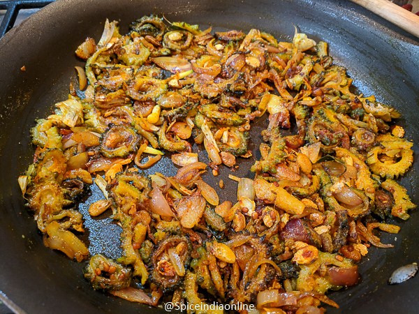 - The mixture will turn dry, the onions will caramelize and the bitter gourd will turn soft with crisp edges.