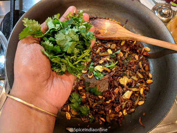 - Add in the chopped coriander leaves and curry leaves and saute for another few minutes and switch off.