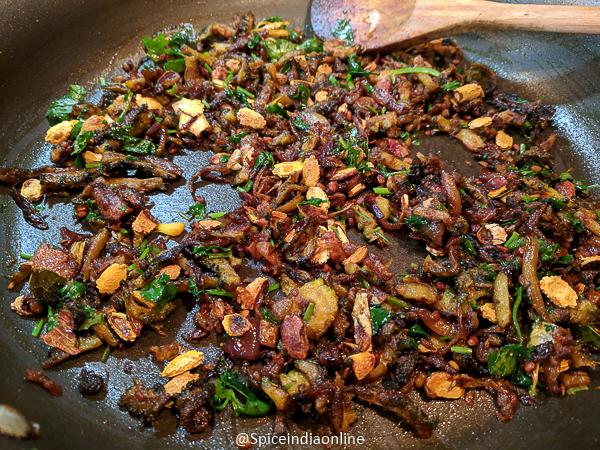 Slow roasting will gradually caramelize the onions, the bitter gourd will turn brown and lightly crisp. Those dals will turn crunch crunch. KAKARAKAYA KOORA