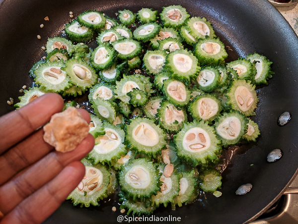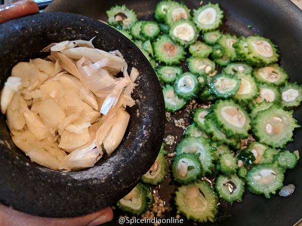 - Add in the sliced bitter gourd with jaggery and crushed garlic (with skin) and saute for few minutes over high flame.