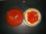 Boil the whole tomatoes, let it cool then remove the skin of the tomatoes and grind it to puree. Heat olive oil in a pan add cloves and cinnamon then add onions when it is pinkish add tomato puree , tomato ketchup, sugar, salt, red chilli seeds, ajwain and let all boil till thick ,so that it can be easily spread on pizza base .