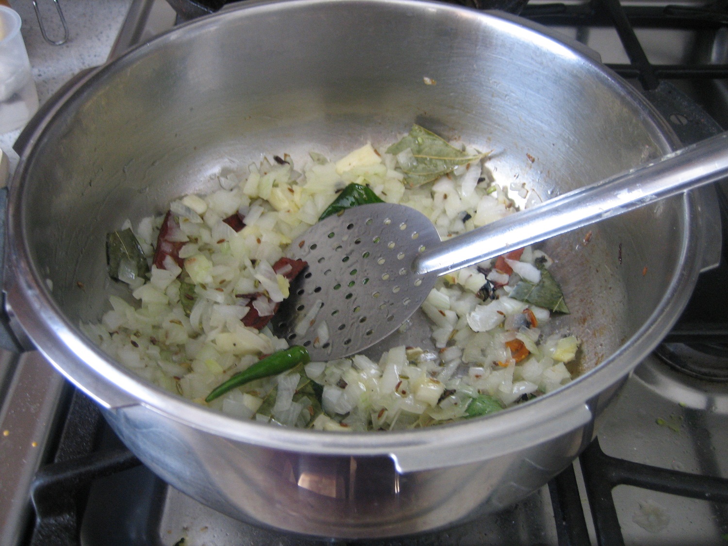 - Add onions & saute until it turns lightly golden. Add green chillies for extra heat.