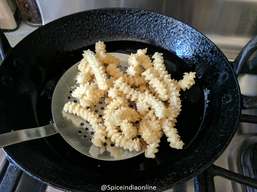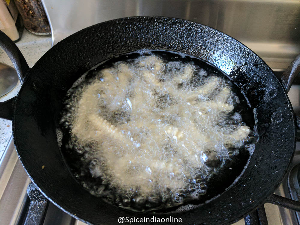 Deep fry the murukku in hot oil in batches until golden. As soon as you drop it will bubble vigorously and fry, flip to cook the other side and fry till it turns golden. Once its done the all the vigorous bubbles will settle and the sizzle will stop.