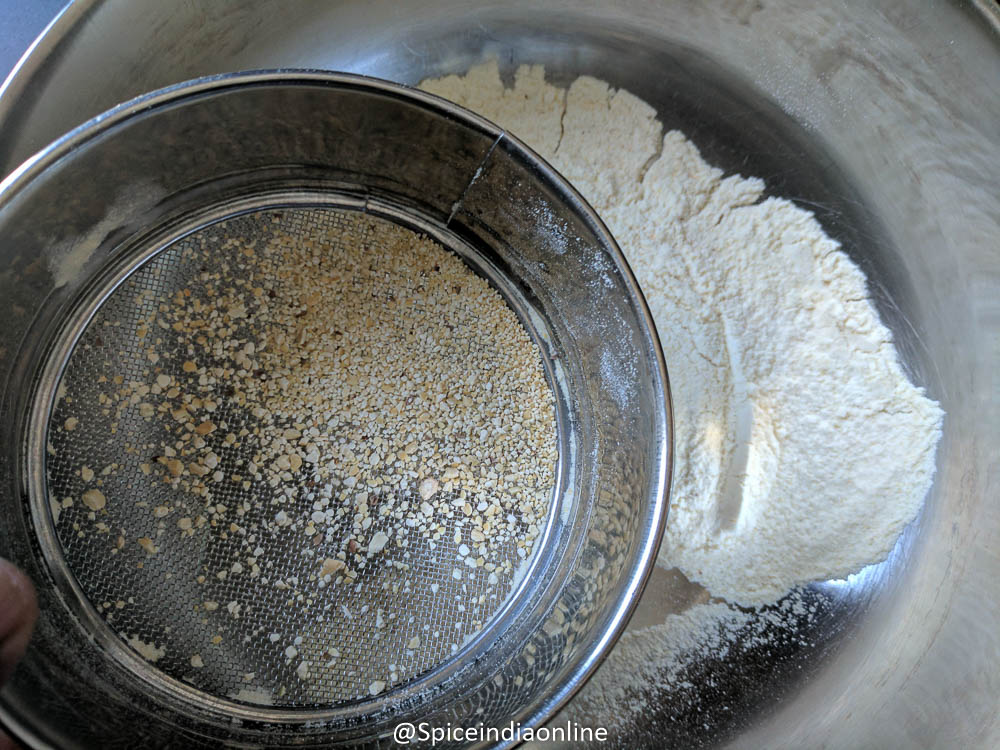 Sieve using a fine mesh and get rid of all the big grains. If you skip this then it may get stuck in the murukku press and may not shape well or break while pressing.