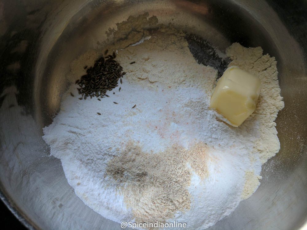 Combine rice flour, roasted gram flour, asafoetida, salt, cumin seeds and butter.