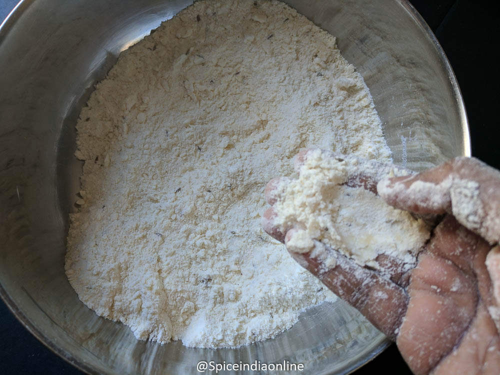 Sprinkle water little by little and start making a dough. Also side by side heat enough oil for deep frying.