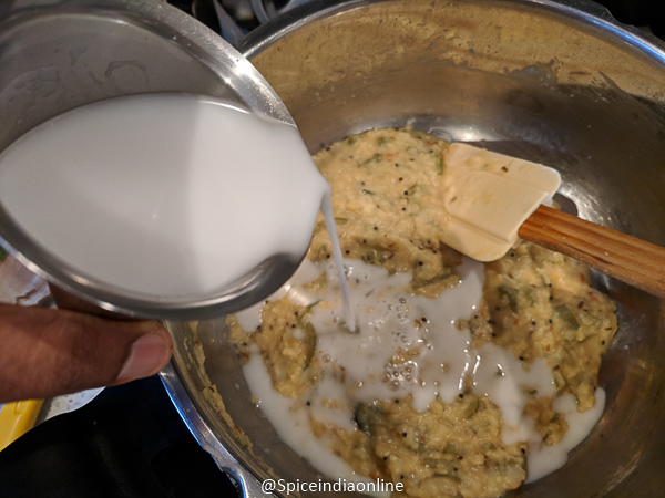• Gently mash it with a ladle and add in 1 cup coconut milk and simmer for few minutes. Switch off!