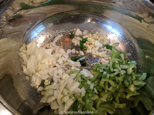 • Add in chopped onion, green chili, ginger and chopped snake gourd. Saute well for few minutes.
