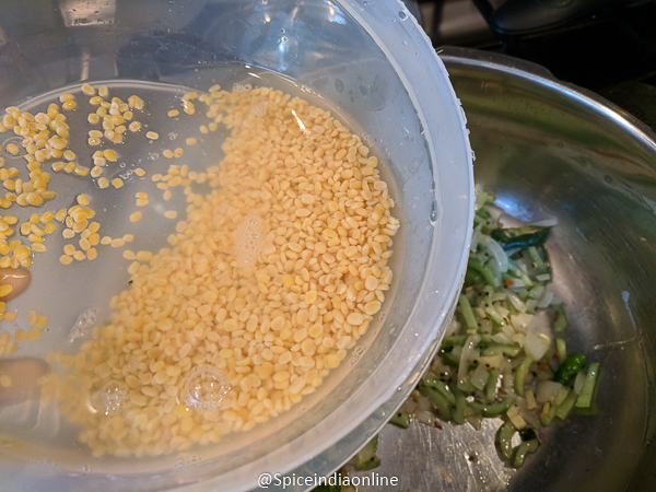 • Soak Moong dal for 30 minutes. Also wash, scrape the white skinny skin on top of it… cut open remove all the seeds & the spongy tissues (discard). Chop the thick layer of the veggies into tiny pieces.
