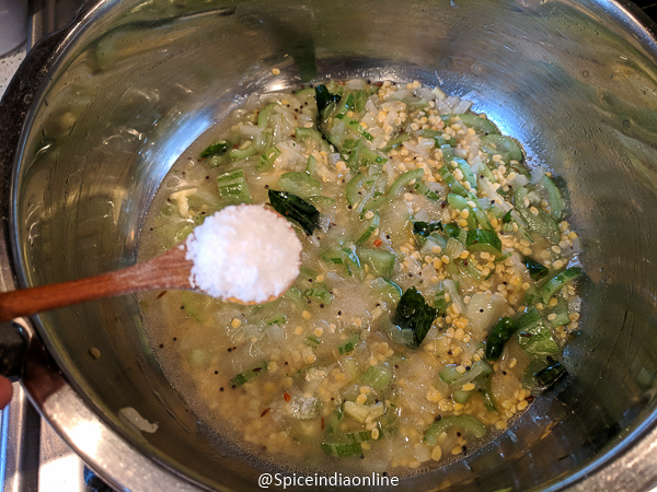 • Now add in the soaked moong dal along with 1 cup water.  Add in salt. Cover and pressure cook upto 2 whistles.