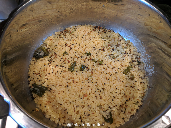 • Heat ghee and oil in a pressure cooker pan and temper with mustard seeds, split black gram, cumin seeds, asafoetida and curry leaves.