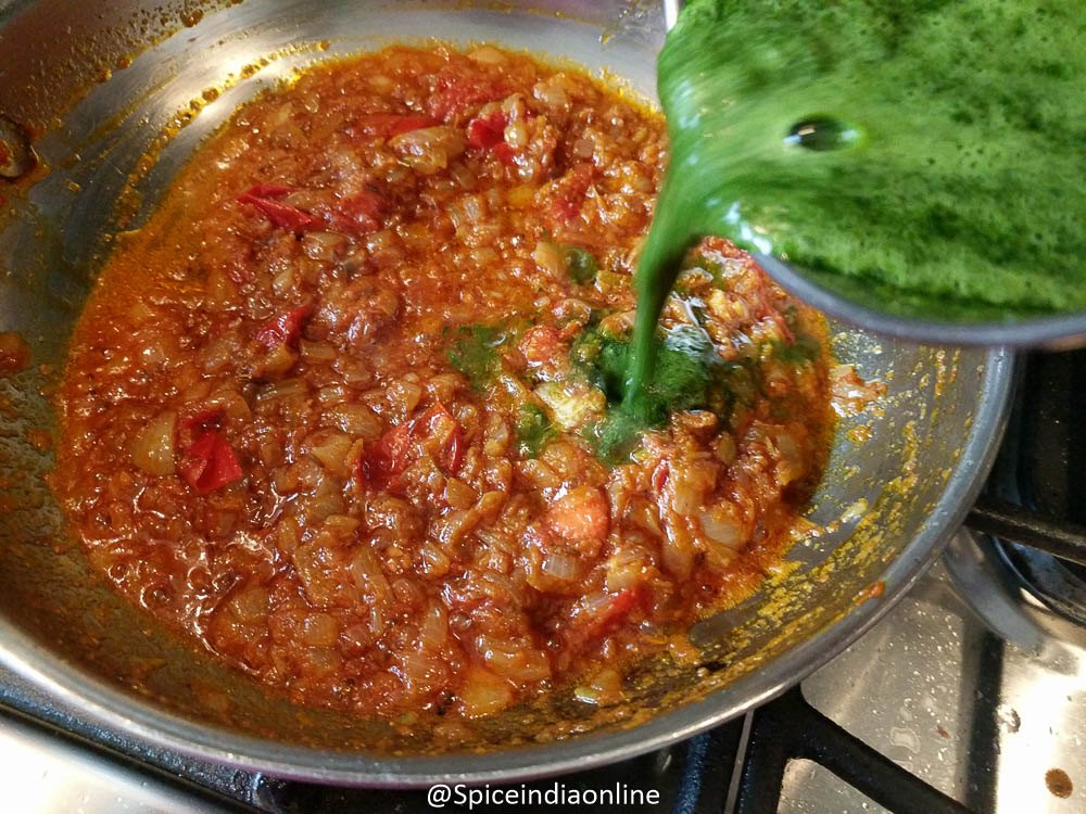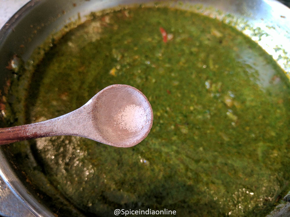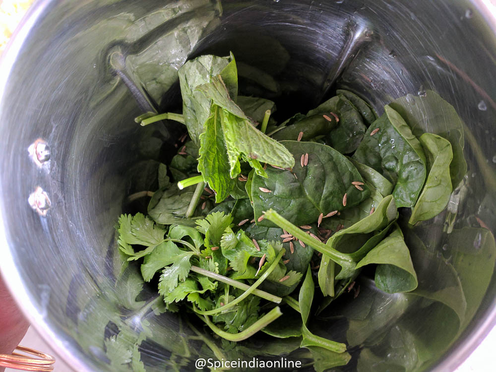• Grind the spinach, mint, coriander leaves along with green chilies and cumin seeds. You can add water to run your mixer. Make a paste or semi light puree and keep this aside.