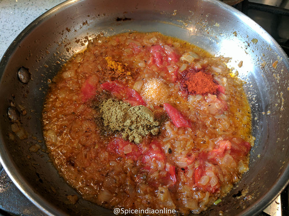 • Now for the masala powders… turmeric powder, coriander power and red chili powder and salt. Fry the masala till its blends well with the onion mixture and browns a bit.