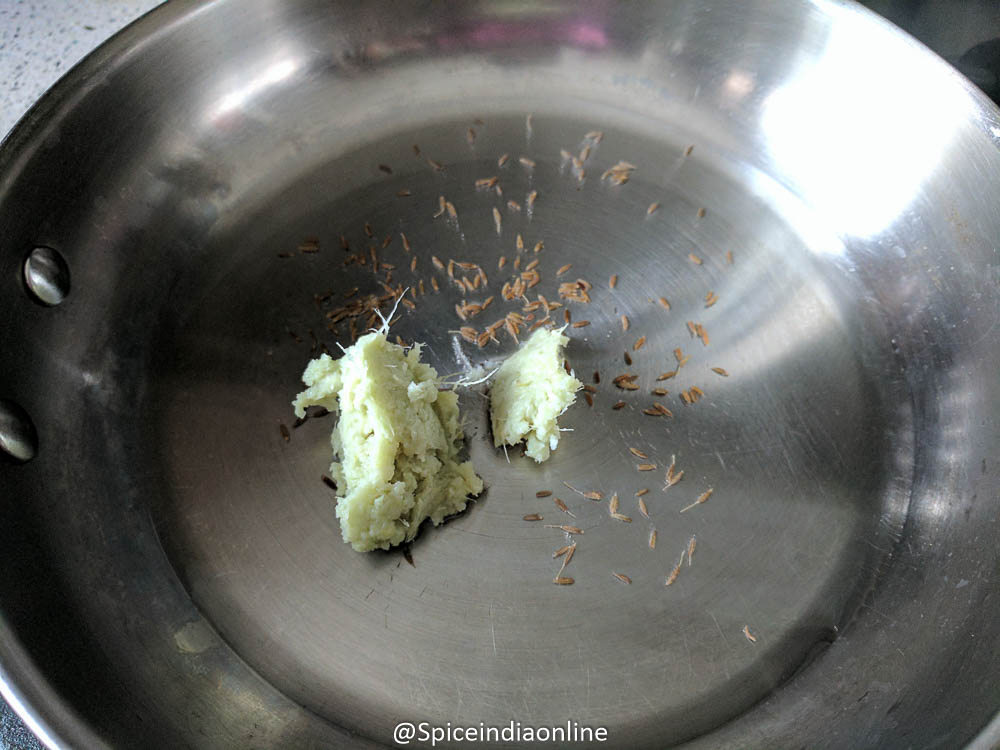 Heat oil in a pan, splutter cumin seeds and immediately add the ginger garlic paste.