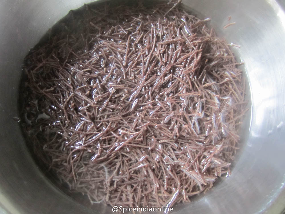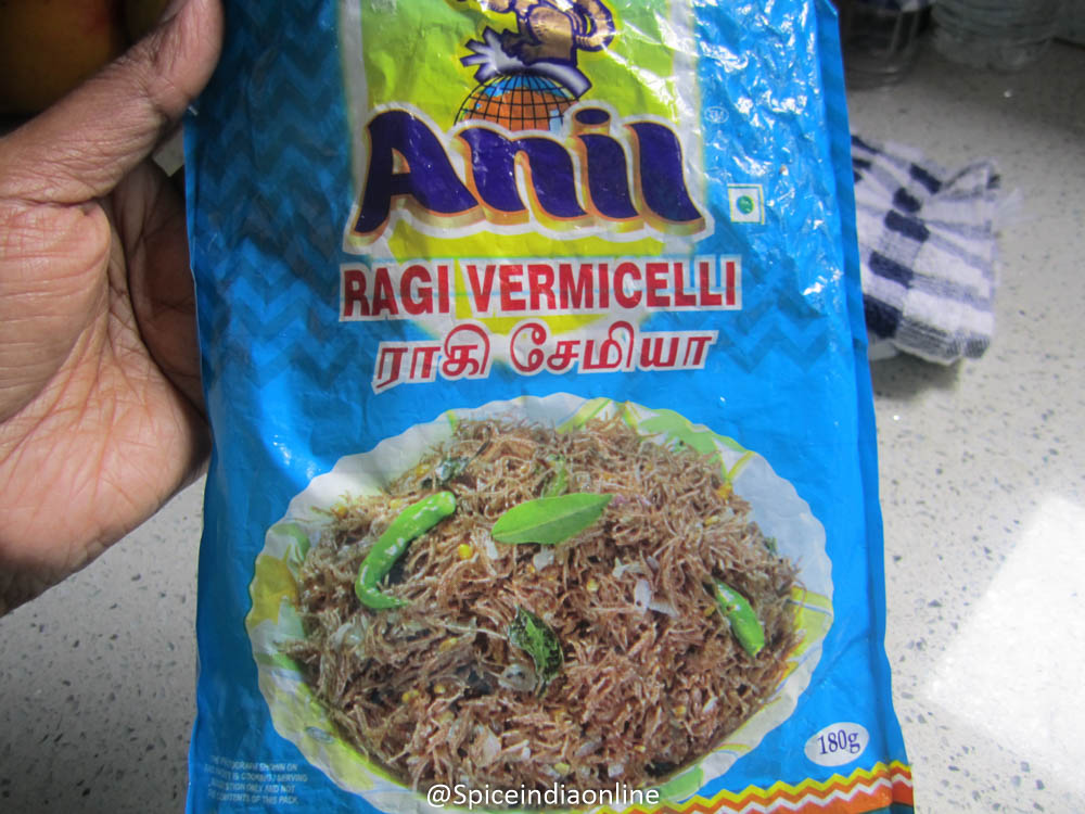 This one pack of Ragi Semiya roughly serves 2-3 adults as a light tiffin as its pretty filling. Ragi semiya is easily available in most Indian grocery stores here in USA. We are going to make one full pack today.