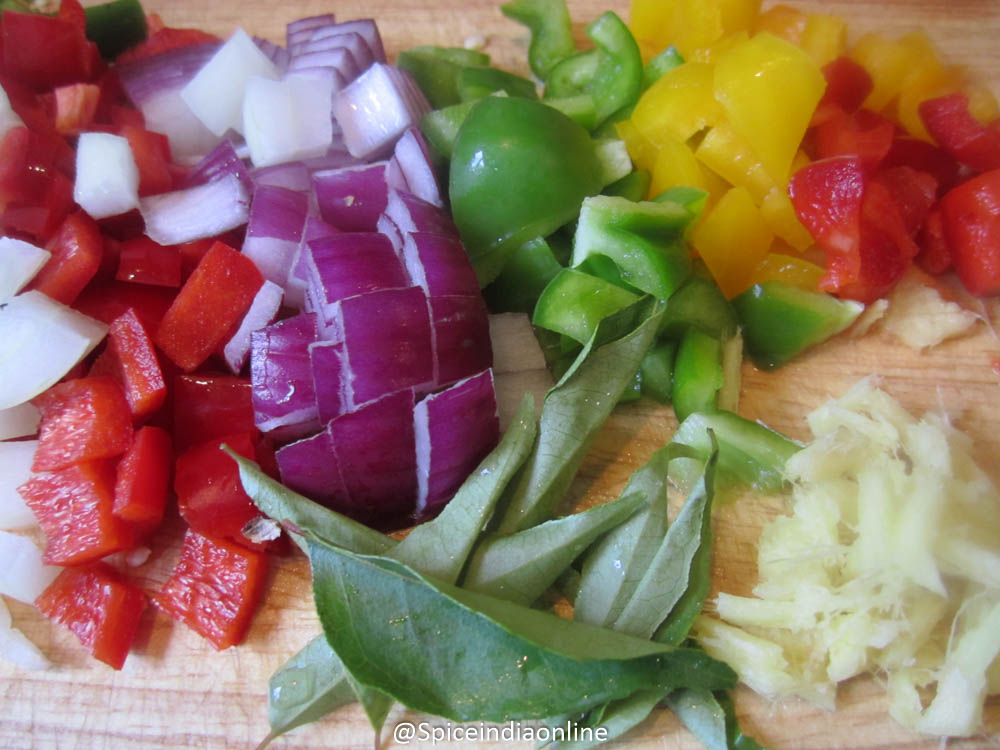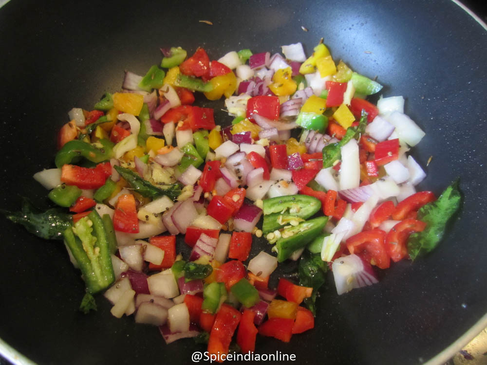 Heat oil in a frying pan, splutter mustard seeds, split black gram, cumin seeds and curry leaves. Sprinkle some asafoetida powder and then add the onion, green chilies, ginger and mixed color capsicums. Add some salt and saute to cook the veggies.