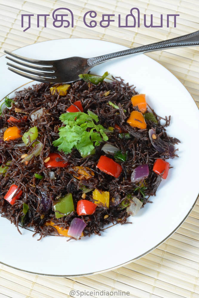 Ragi – known as Finger Millet is very very nutritious and offer many health benefits. It can be used in number of ways.. we must have had ragi malt which is very common in many households, amma at home makes adai, congee, koozh, dosai and snack items with ragi. Recently this product is hitting the shelves in most stores in the form of vermicelli and sevai… we at home love upma for breakfast and ever since I saw these I’m hooked to it! Ragi as such is not that visually appealing and also taste bland but with some added color and flavor – its definitely taste good. It can be prepared as a sweet upma too, today I will be sharing the savory version which can be served as breakfast or tiffin.