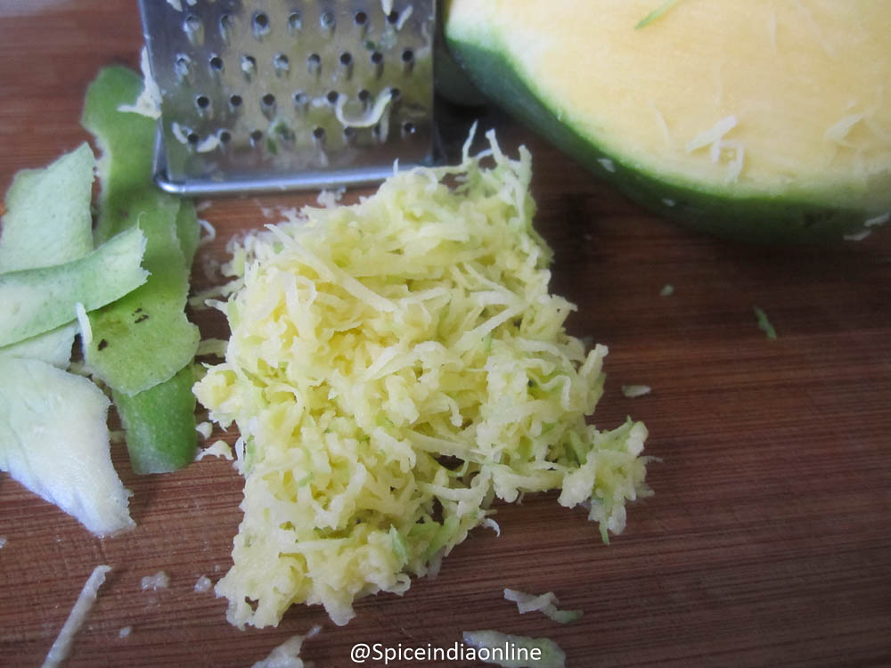 Peel the mango skin and grate the flesh and keep aside. We want about 1 cup of grated mango for 2 cups of cooked rice.