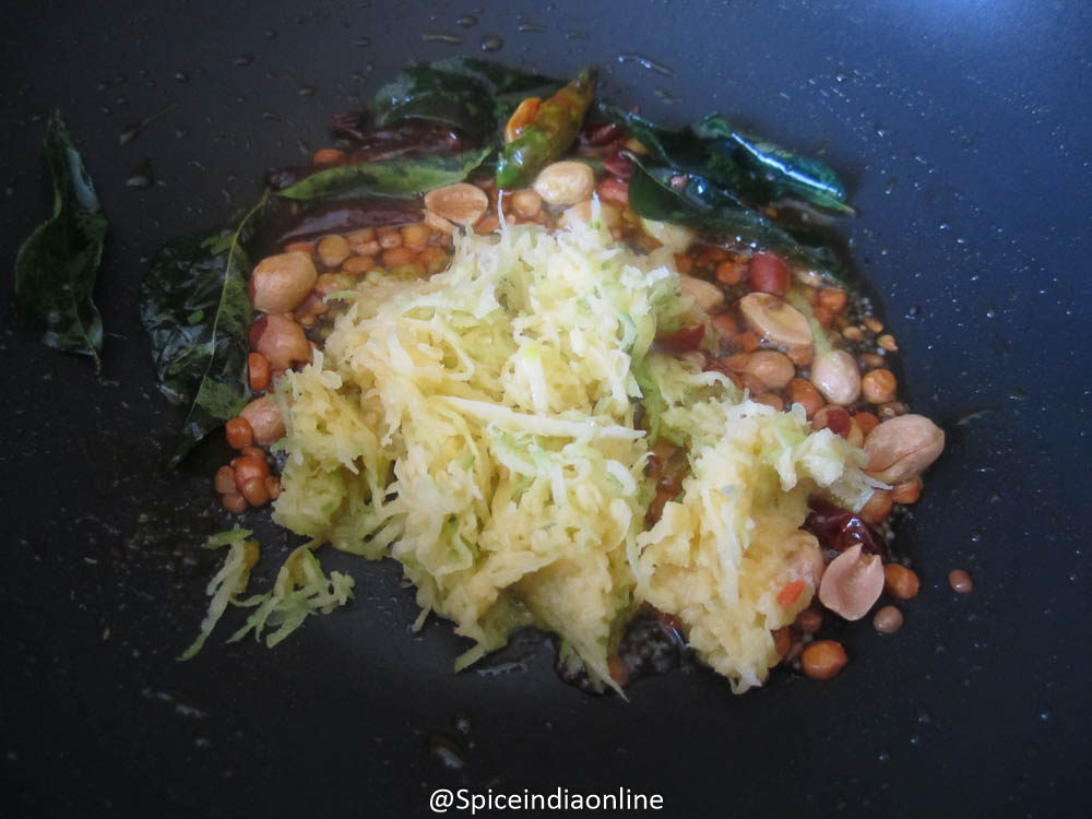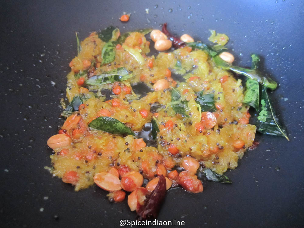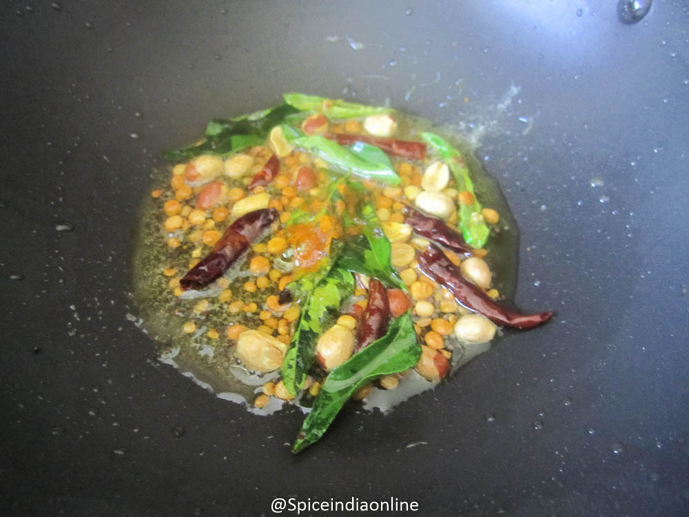 Heat oil in a pan, splutter mustard seeds, split black gram, bengal gram and peanuts. Roast them till golden and then add the curry leaves, red chilies and green chili. Sprinkle the asafoetida powder and add in the turmeric powder.