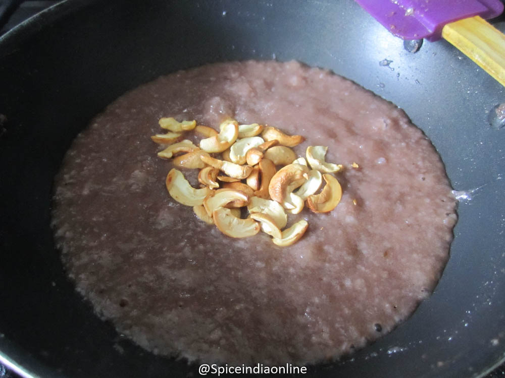 Now the mixture will turn slightly thick, add the toasted cashews, cardamom powder and remaining ghee. Keep stirring till the kesari thickens and leaves the sides of the pan.