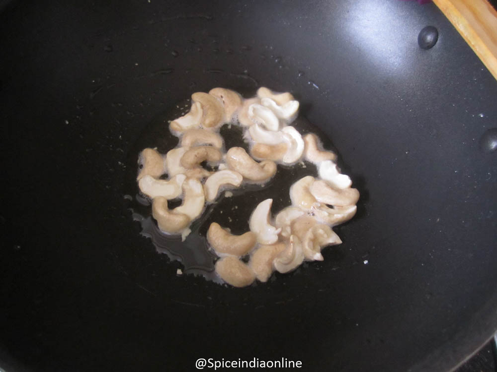 Heat one tablespoon of ghee in a pan and toast the cashews to golden brown and set aside.
