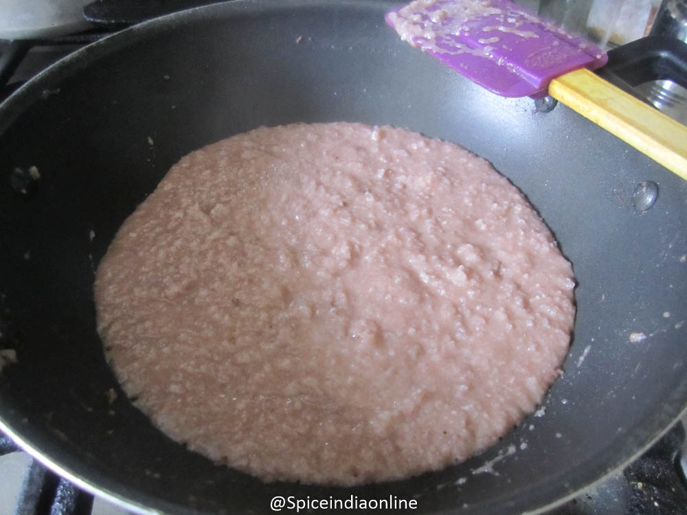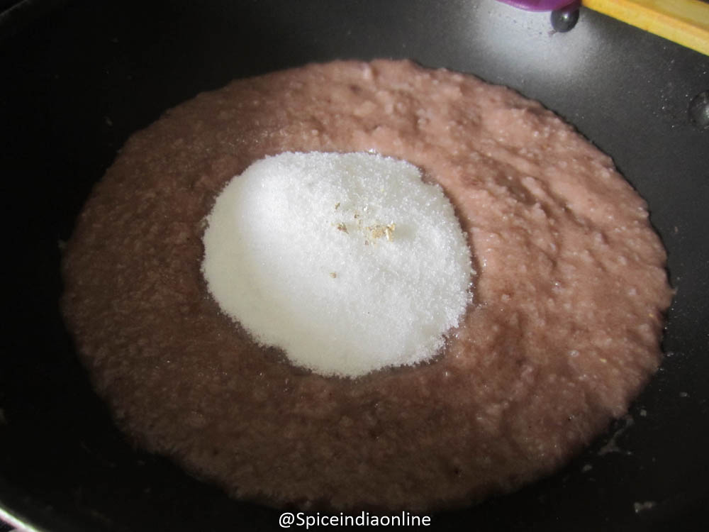 Slowly the aval will start to drink up all the water as it cooks. Once it absorbs all the water, add sugar. Again the mixture will turn watery when the sugar melts… let the sugar dissolve well and incorporate with the mixture.