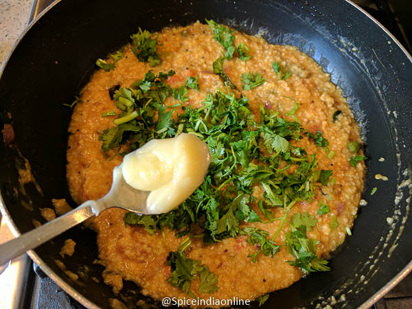 Once the mixture thickens to desired consistency, garnish with chopped coriander leaves and add in a teaspoon of ghee and switch off!