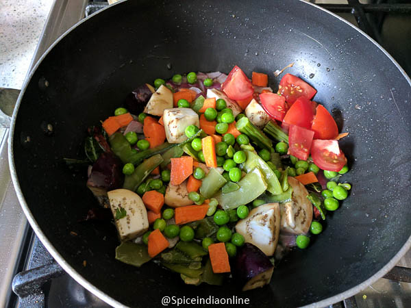 Throw in all the veggies and chopped tomatoes. Saute over high flame for few minutes.