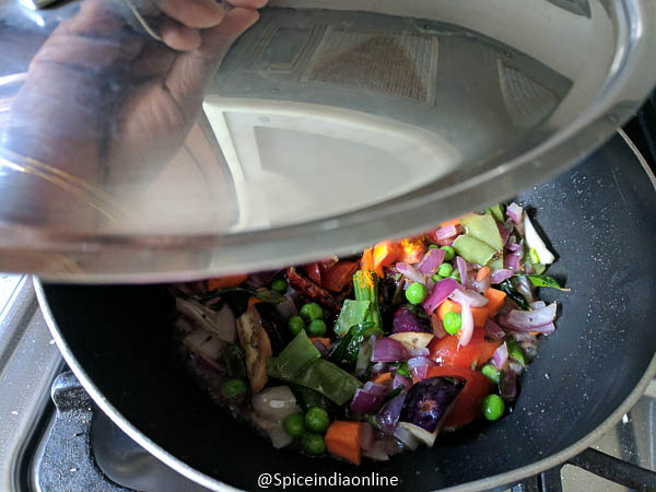 Sprinkle some water, cover and cook for 15 minutes over low flame. (Alternately you may use a pressure cooker to cook all these to save time. Some veggies like drum stick may take longer to cook. Make sure to cook the veggies before hoping to next step)