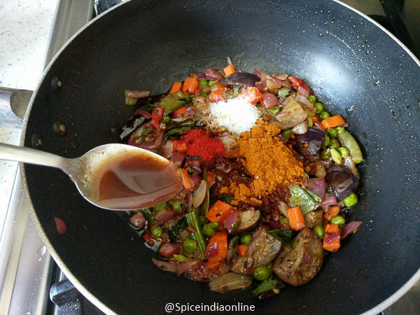 Once the veggies cook tender but firm, add in turmeric powder, coriander powder, red chili powder, salt and tamarind extract. Saute for few minutes.