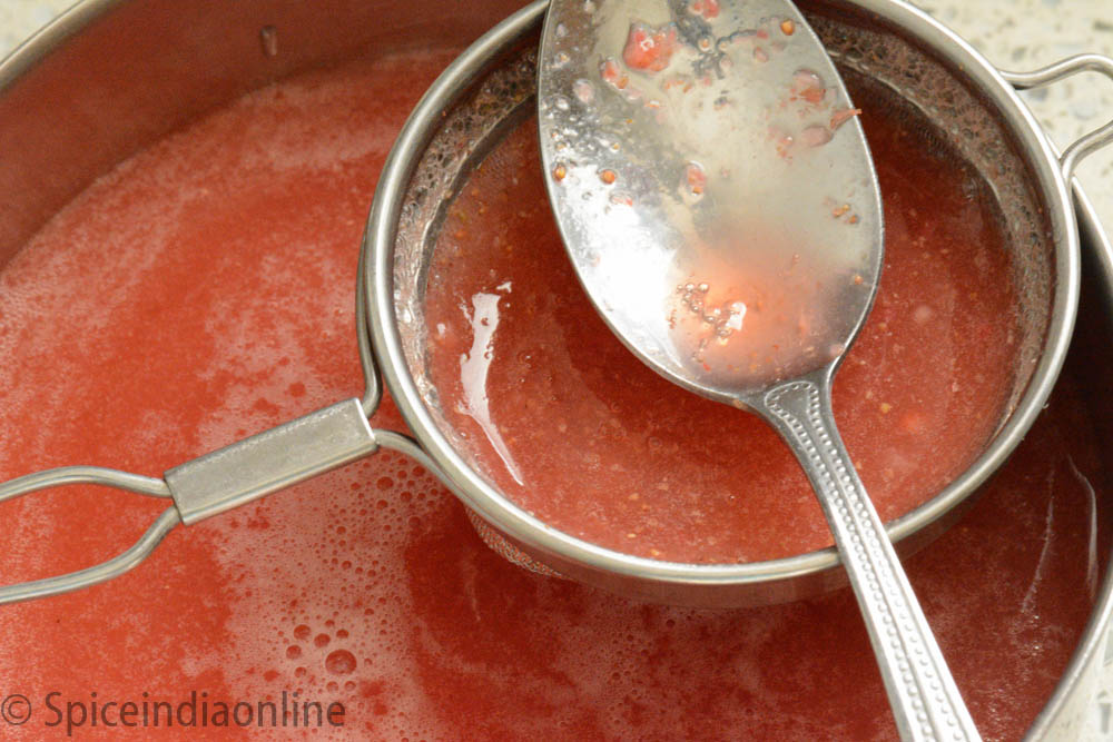 Use a metal sieve (as the one in the picture above) and strain. A jelly strainer will work too, allowing the juice and some healthy pulp to pass through the mesh. Add few ice cubes and serve chilled.