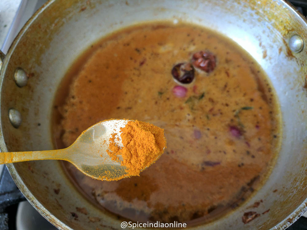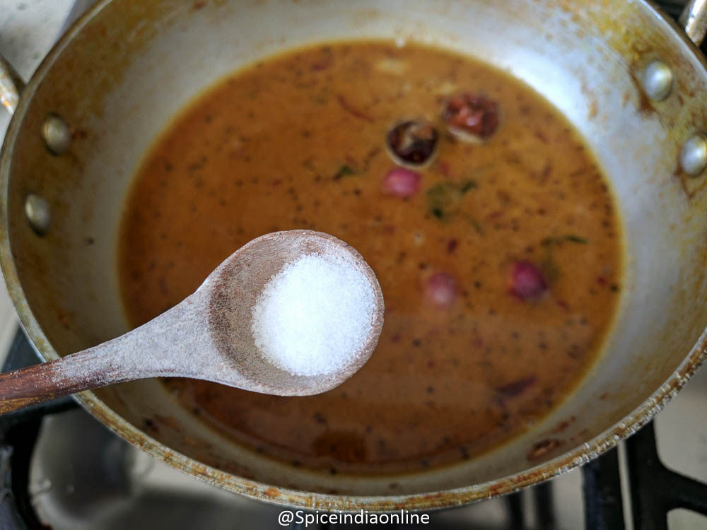 Add in salt at this point – remember some store bought kuzhambu podis / sambar podi / vatha kuzhambu podis and powder comes with added salt. Make sure to taste before you add in salt.