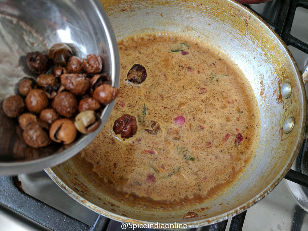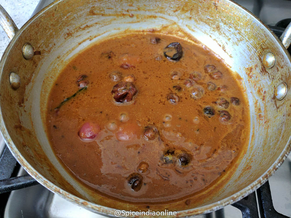 Brins the kuzhambu to a rolling boil…. while thats happening add in the fried sundakkai along with the oil.