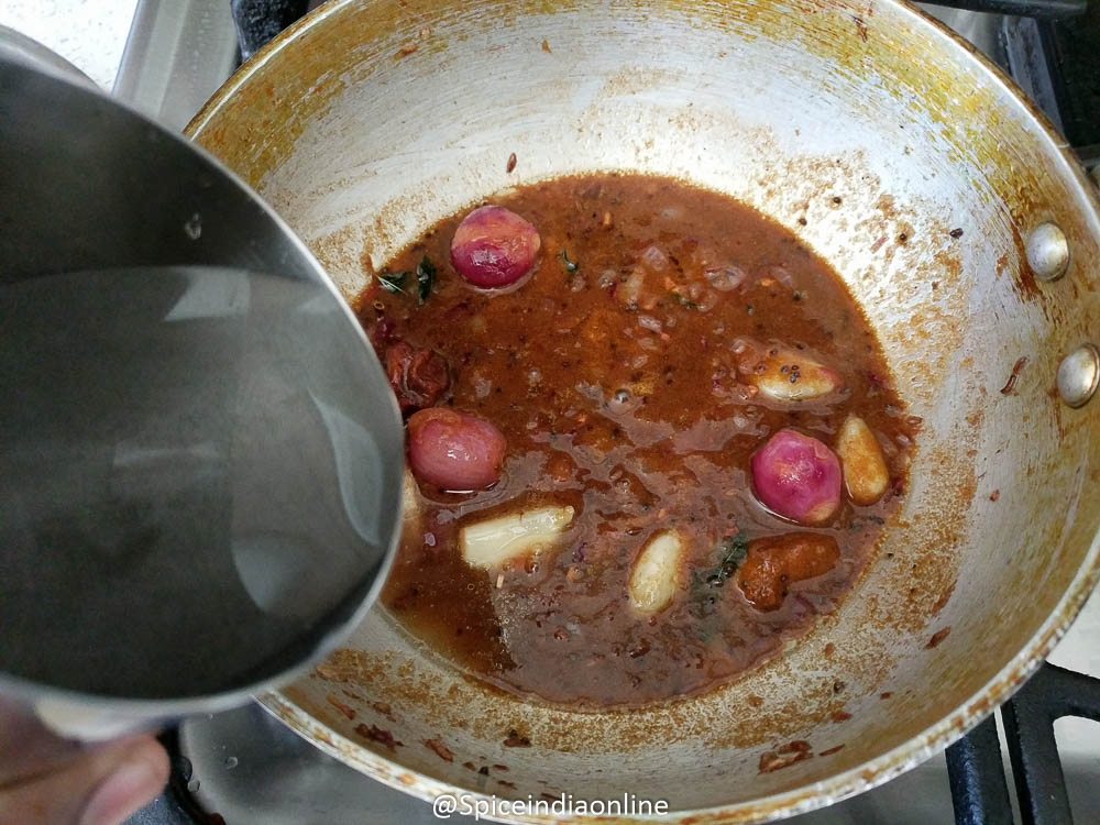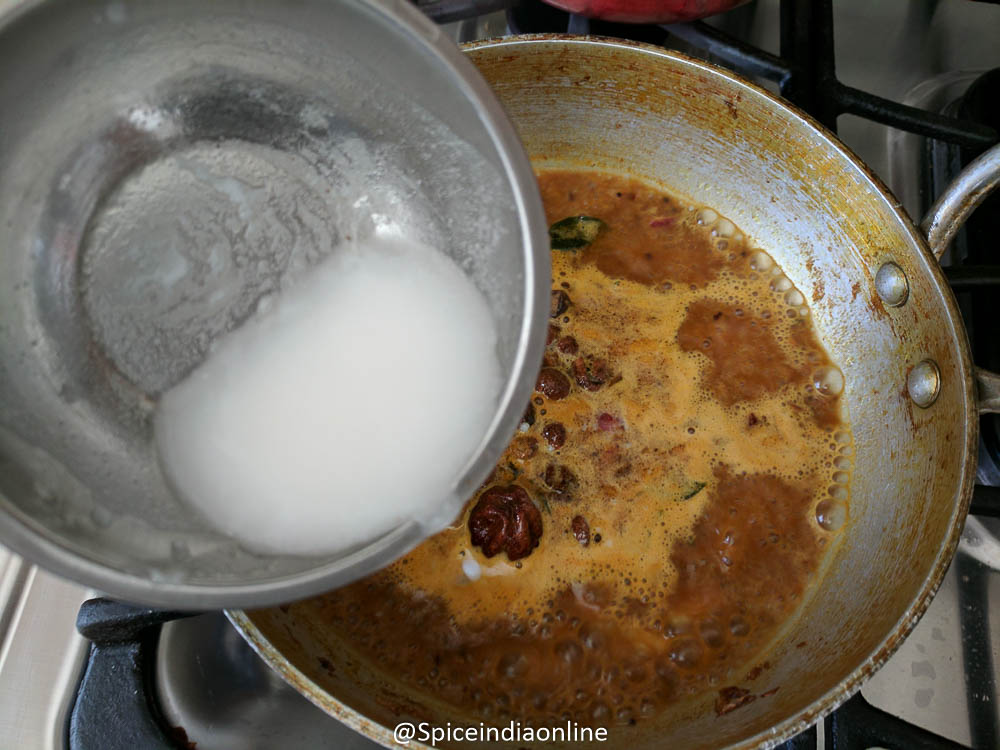Finally mix the rice flour in 2 teaspoons water and add it to the gravy. This basically thickens the kuzhambu and it completely optional.