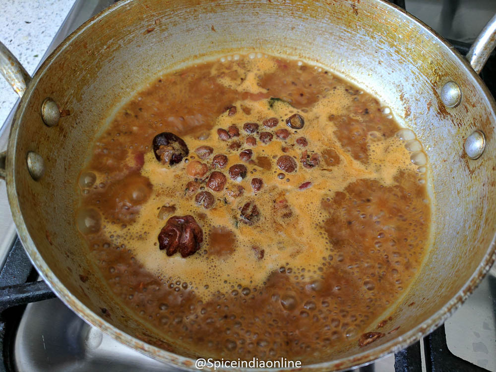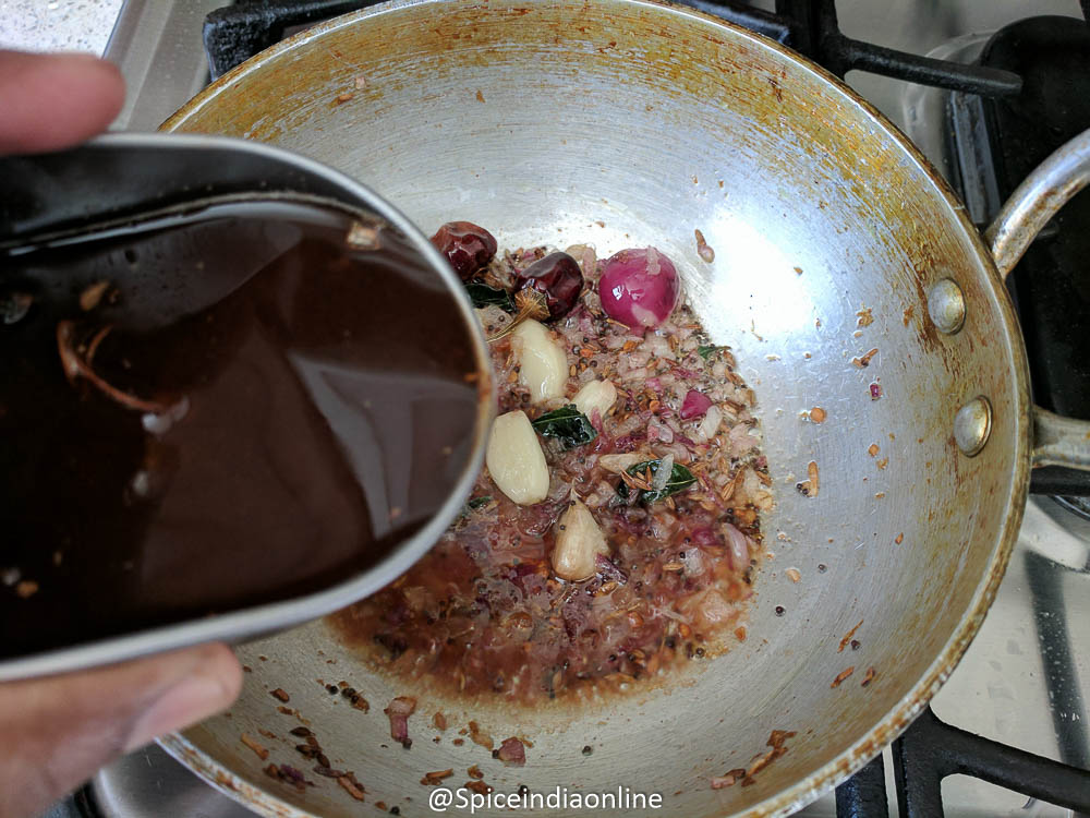 Add in thick tamarind pulp to it and keep the flame at medium.