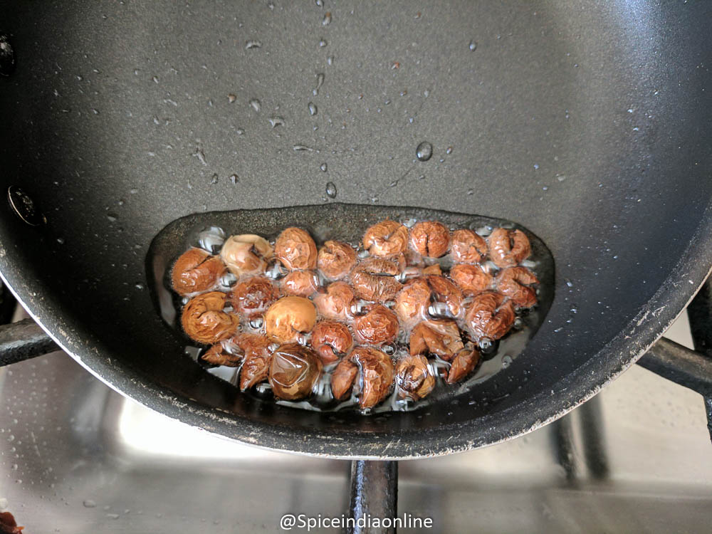 Heat a tablespoon for sesame oil in a small tadka pan and fry the dried berries till they turn brown and keep them aside along with the oil.