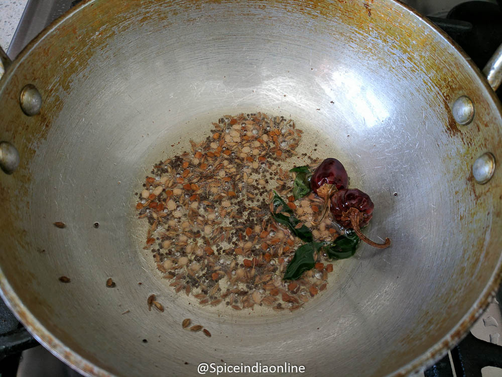 Now heat remaining 2 tablespoons oil in a kadai / pan and splutter mustard seeds, fenugreek seeds, split black gram, dry red chilies, cumin seeds and curry leaves. Let them sizzle a bit.